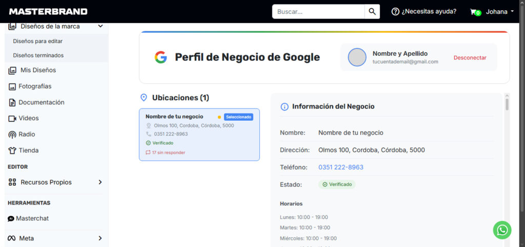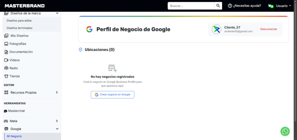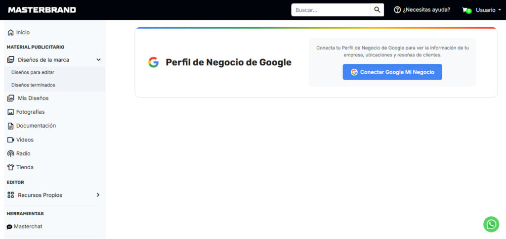 Desde la navegación principal de Masterbrand, localiza la sección de Google -> Mi Negocio. Haz clic en el botón azul “Conectar Google Mi Negocio”. Esto te permitirá centralizar tus reseñas, ubicación y datos de contacto.