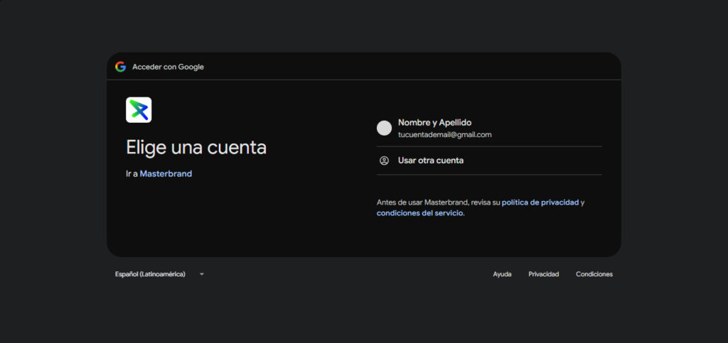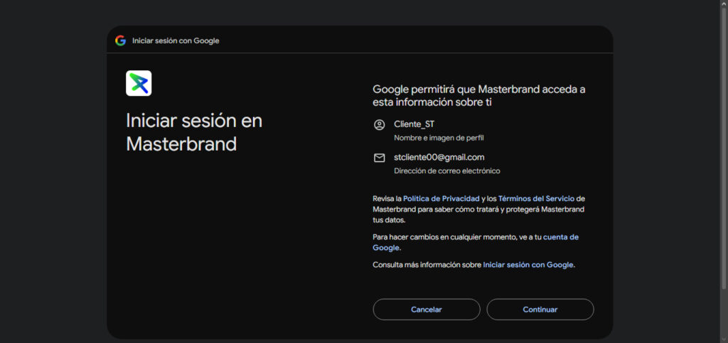 Verás una pantalla de confirmación. Haz clic en “Continuar” para permitir que Masterbrand acceda a la información básica de tu perfil para poder mostrarla en tu panel.