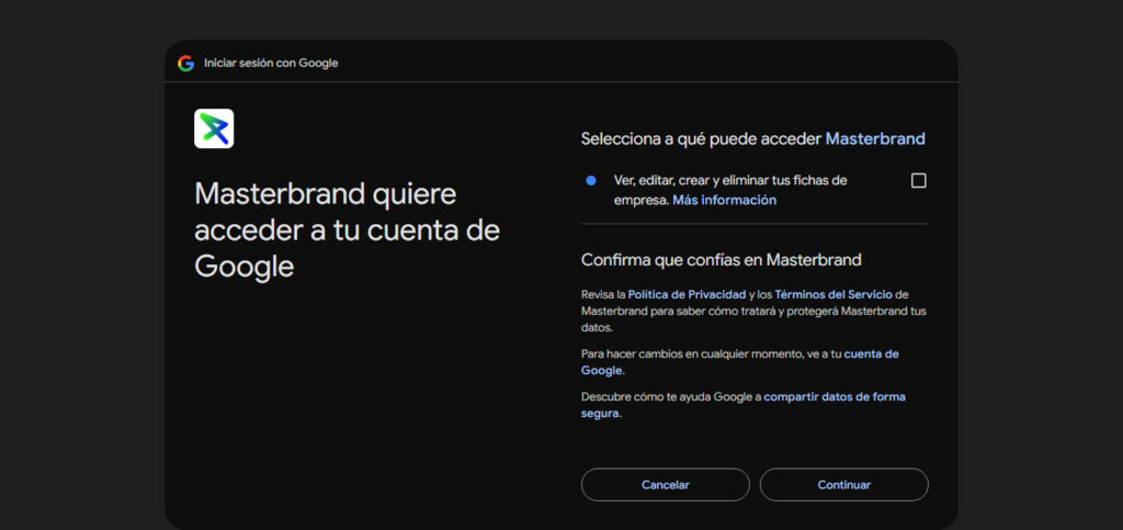 Para que la integración sea completa, marca la casilla que permite a Masterbrand ver y editar tus fichas de empresa y haz clic en “Continuar”. Nota: Masterbrand utiliza esta conexión solo para sincronizar tus datos y facilitarte la gestión, manteniendo siempre tu información segura.